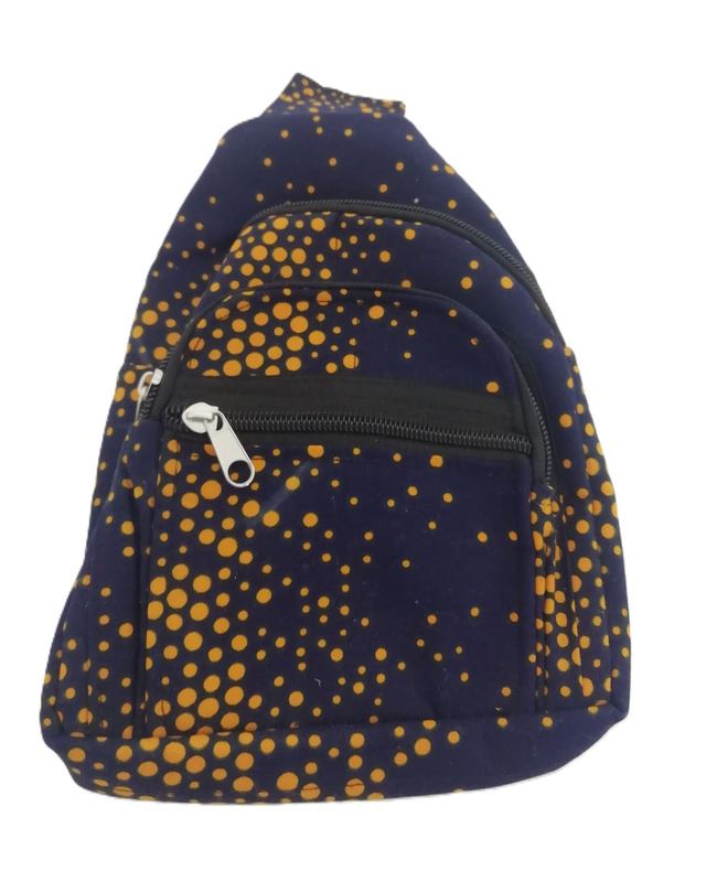 African cloth chest bag with black adjustable strap and zipped pockets.