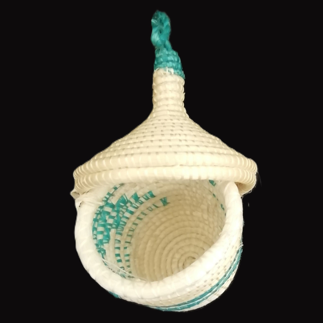 Small woven basket with lids, around 8cm tall. Patterns and colours vary.