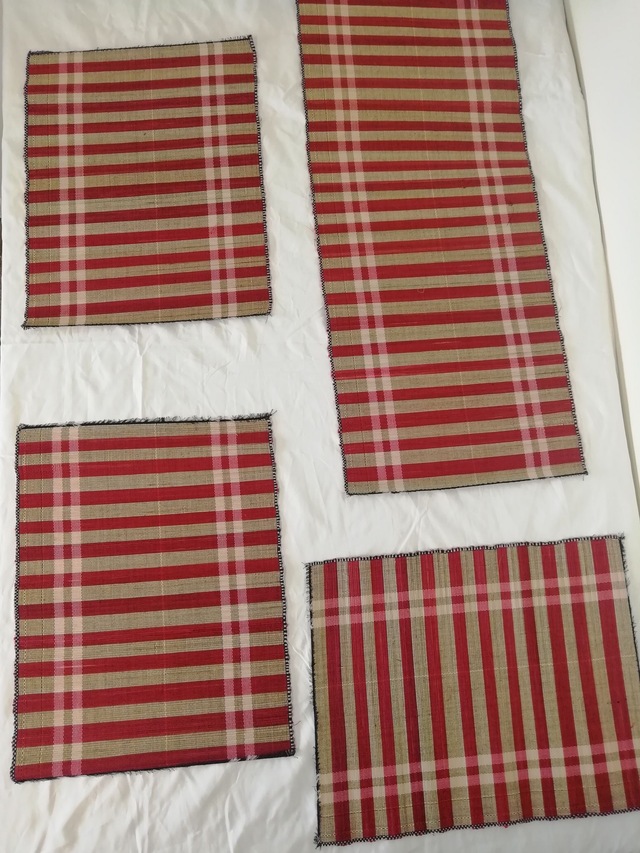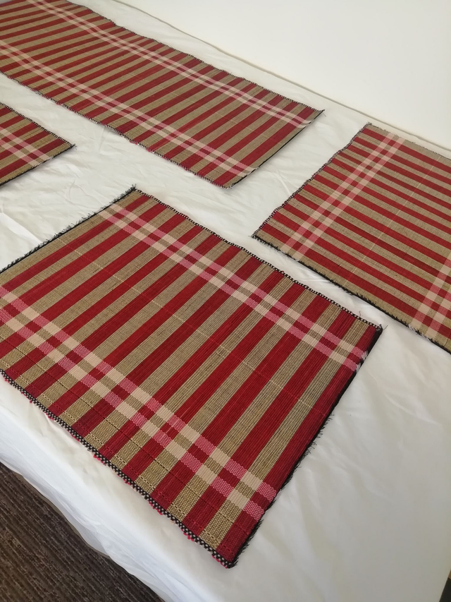 This set comprises of one hand woven table runner (31cmx83cm) and five matching placemats (31cmx40cm).